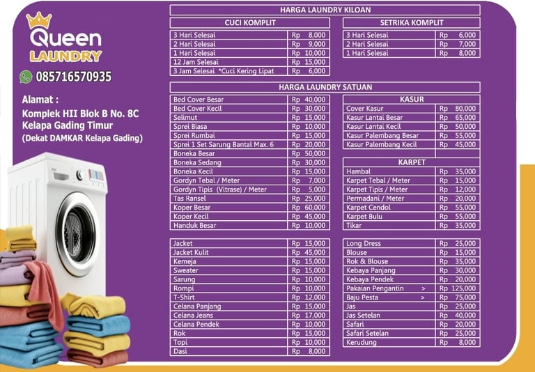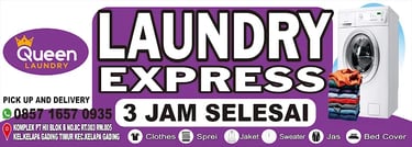 Butuh baju bersih secepatnya? Percayakan pada Queen Laundry, layanan laundry express 3 jam selesai dengan hasil rapi, higienis, dan wangi tahan lama.