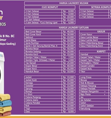 Kami melayani pencucian satuan untuk jas, kebaya, baju pesta, jaket, hingga bed cover dan gordyn dengan standar kebersihan tinggi dan hasil yang rapi, wangi, serta higienis.